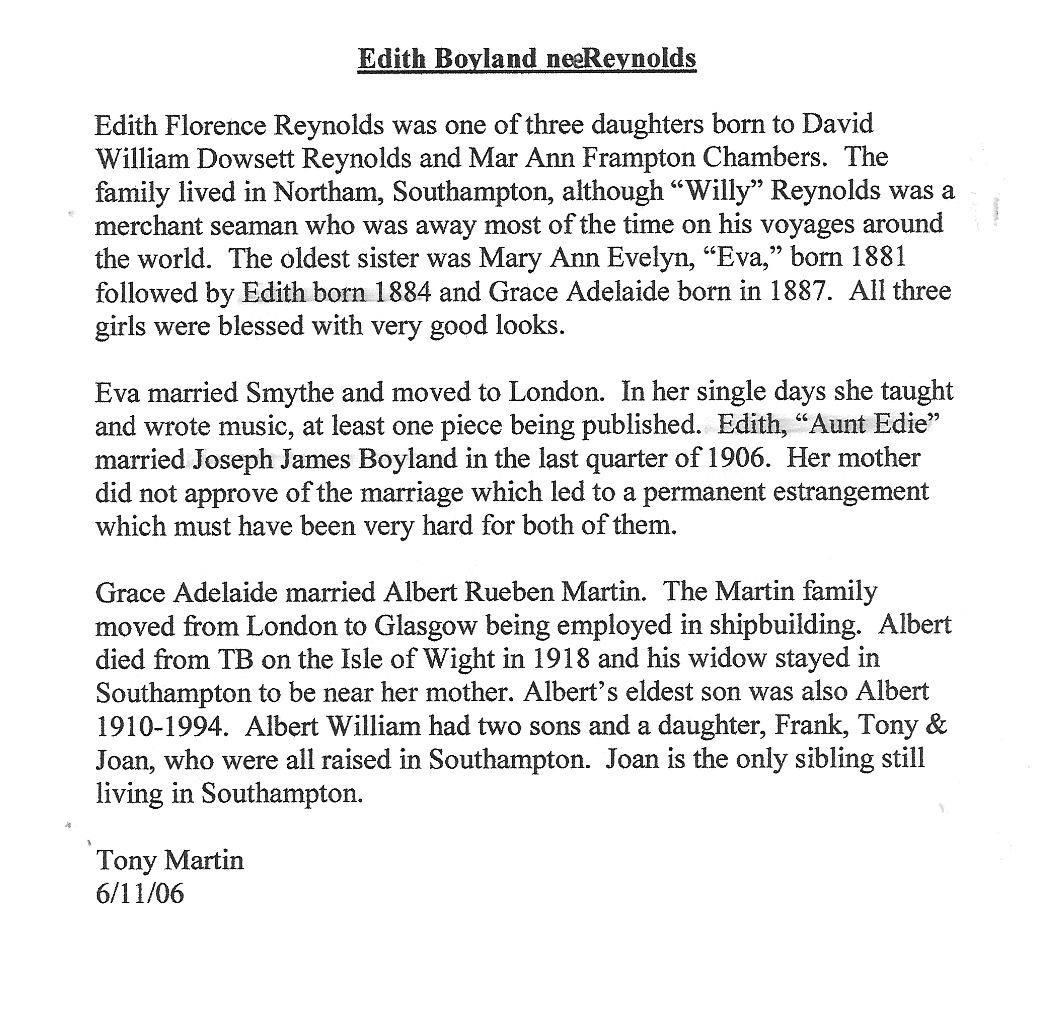 Since recieving the above information from Tim Read,I have researched a little further and with the help of fellow researchers at Rootschat and others,coupled with some detail from Parish Registers as given to me by my cousin Harry Boyland (see Harry's research page) I have put a few things together which I believe looks correct,but if anyone cares to disagree with my findings,please contact me and between us perhaps we can come up with something different?
