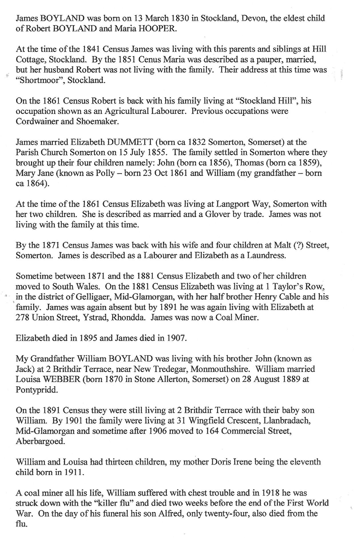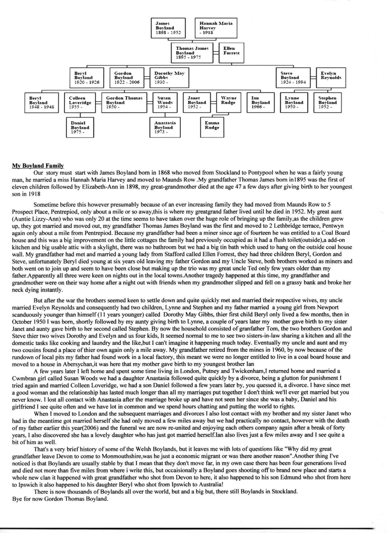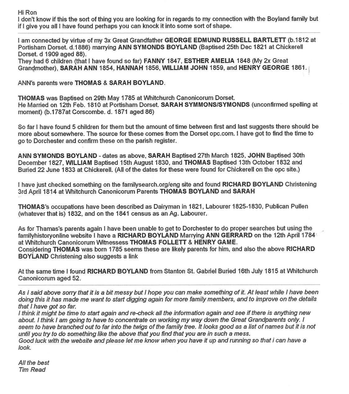 Richard Boyland married Ann Gerard (born 22nd December 1764) at Whitchurch Canonicorum on 12th April 1784 children found so far were THOMAS BOYLAND 29th May 1785 who married SARAH SYMONDS born 1787 at Corscombe Dorset. (her parents were WILLIAM SYMONDS and Martha,from Upwey,Dorset. Thomas and Sarah married on 12th February 1810. Children were-FRANCES BOYLAND 29th August 1812--RICHARD BOYLAND 3rd April 1814.-ANN SYMONDS BOYLAND 25th December 1821,at Chickerell Dorset.--JOHN BOYLAND 30th December 1827.--WILLIAM BOYLAND 15th August 1830.--THOMAS BOYLAND 13th October 1832 he died 1833. There is also an ANN BOYLAND Baptised 27th May 1798 to Thomas and Sarah,but the dates seem to be wrong?