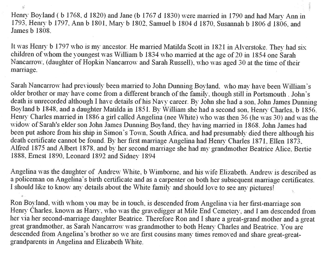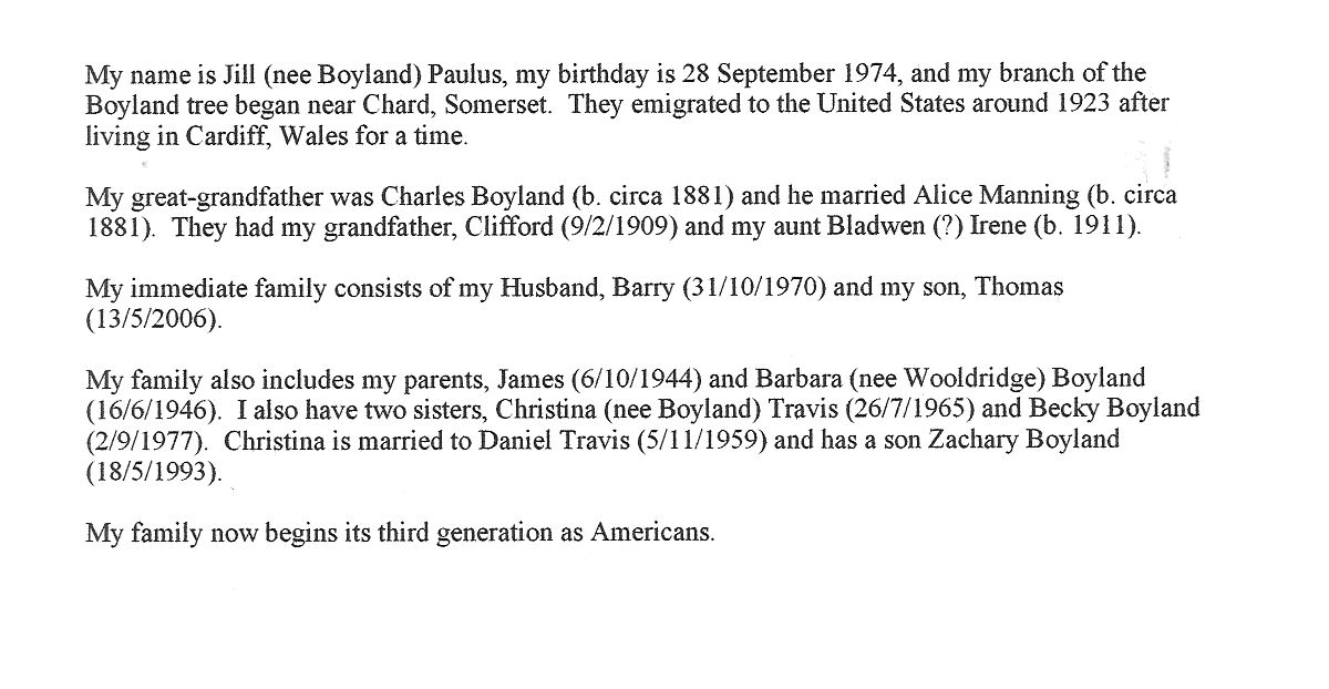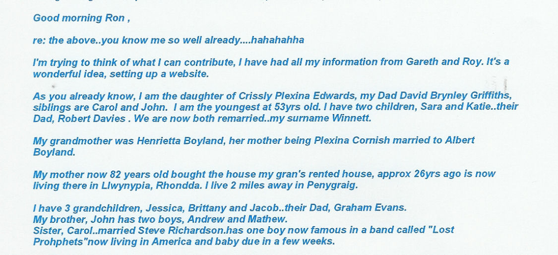 Ok, back to it....I am the daughter of Ann Russell, nee Boyland. Her parents are Henry and Lillian Boyland. She has two brothers, David and John. John has six children of his own so i also have many cousins and they have children....and it goes on.
